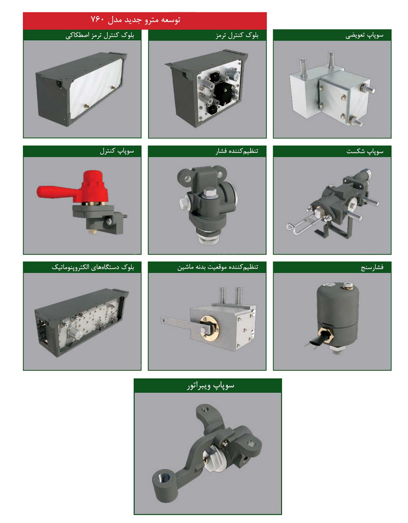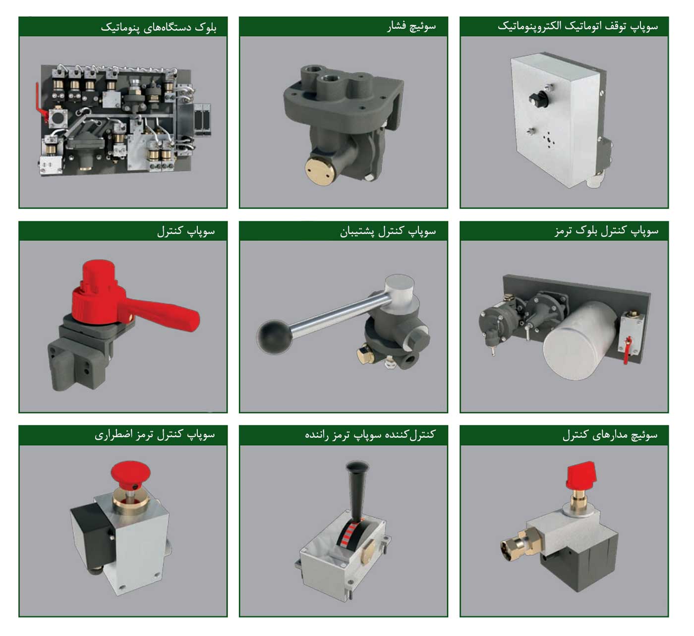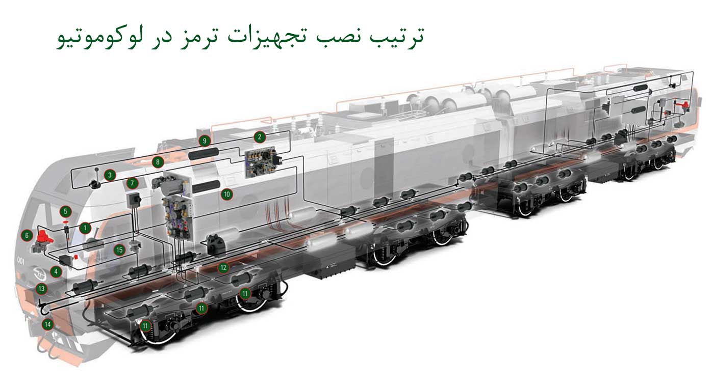 | ۳) سوپاپ کنترل پشتیبان | ۸) بلوک چیدمان تجهیزات ترمز در لوکوموتیوهای باری | ۱۳) شیلنگ اتصال |