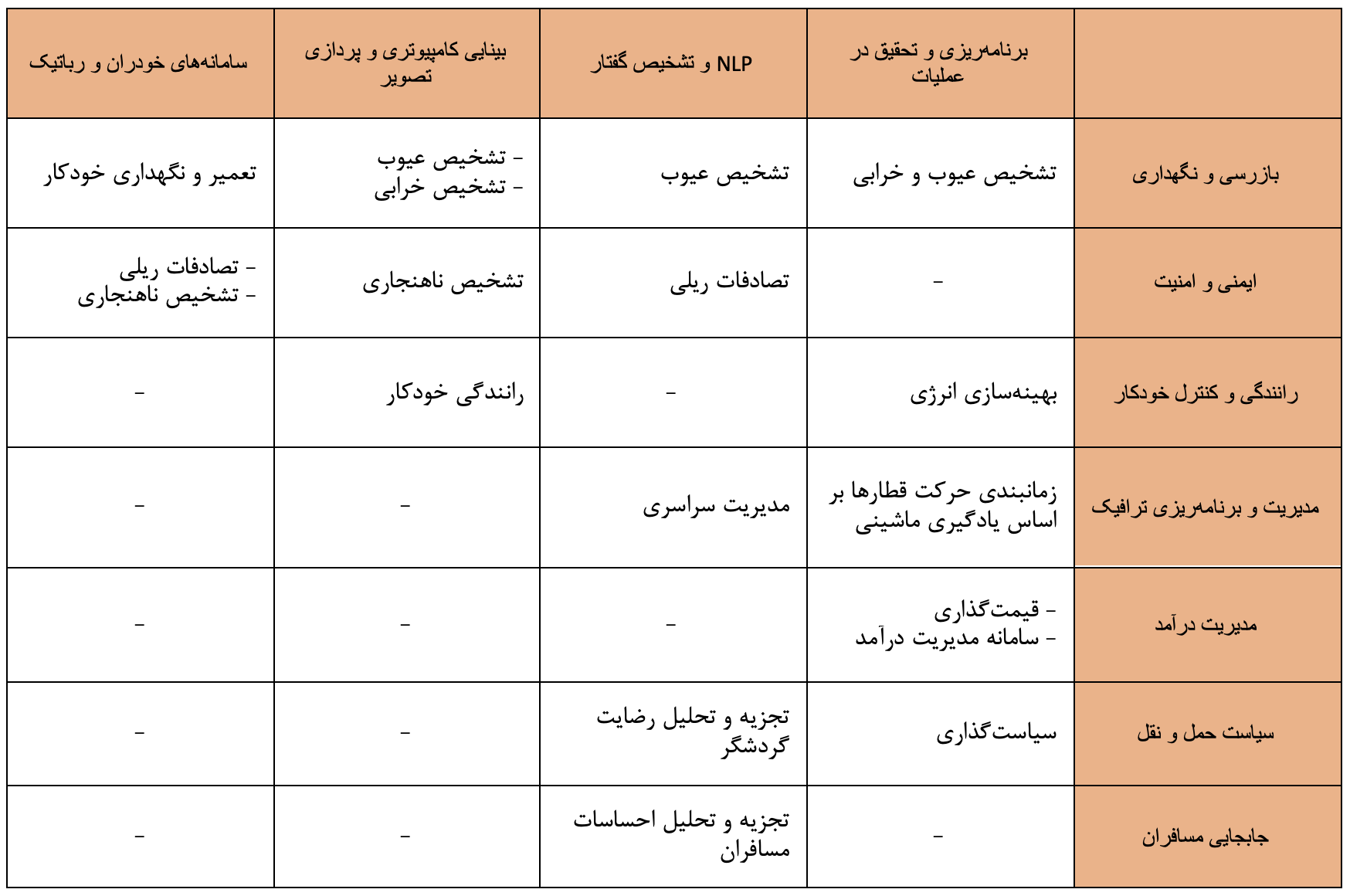 جدول ۳: راهکارهای حاصل از توانمندسازی حوزههای صنعت ریلی با برنامههای کاربردی هوش مصنوعی
